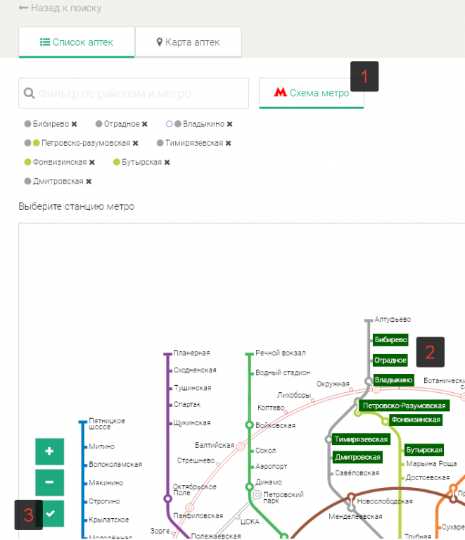 Вам действительно нужен поиск именно по всей линии метро? Просто выделить нужные станции на схеме метро недостаточно? Попробуйте, как на скринеСветлана К: 25 сен 2017, 18:10Стало только хуже искать нужные лекарства, нет возможности отфильтровать по линии метро, приходится весь список смотреть - это крайне неудобно и долго